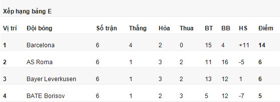 Cũng bị cầm hòa không bàn thắng trong cuộc tiếp đón BATE Borisov (xem video) nhưng AS Roma vẫn theo chân Barca giành vé đi tiếp. Đội chủ sân Olimpico kết thúc vòng bảng với 6 điểm như Leverkusen nhưng trội hơn ở thành tích đối đầu.