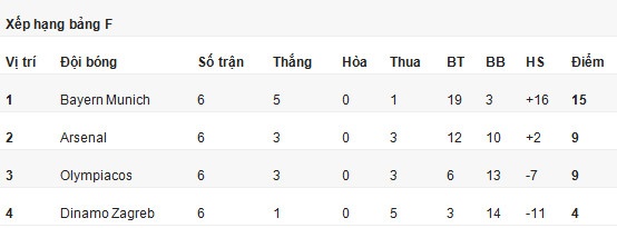 Arsenal khởi đầu tệ hại ở bảng F khi nhận liên tiếp 2 thất bại trước Dinamo Zagreb và Olympiacos. Chiến thắng ở lượt trận tiếp theo trước Bayern Munich cũng không khiến cơ hội trở nên sáng sủa hơn với thầy trò huấn luyện viên (HLV) Arsene Wenger bởi “Pháo thủ” gục ngã 1-5 trong chuyến viếng thăm Allianz Arena ngay sau đó.
