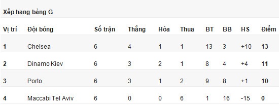 Chiến thắng 2-0 giúp Chelsea vươn lên dẫn đầu bảng G với 13 điểm. Trái lại, trắng tay rời Stamford Bridge khiến Porto phải xuống chơi tại Europa League do ở trận đấu cùng giờ, Dinamo Kiev vượt qua Maccabi Tel Aviv 1-0 nhờ pha lập công của Denis Garmash (16’) (xem video).