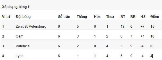 Cùng với chiến thắng 2-1 của Gent trước đội đầu bảng Zenit St Petersburg ở trận đấu cùng giờ (xem video), Valencia bị đẩy xuống Europa League khi chỉ nắm trong tay 6 điểm sau 6 vòng đấu.