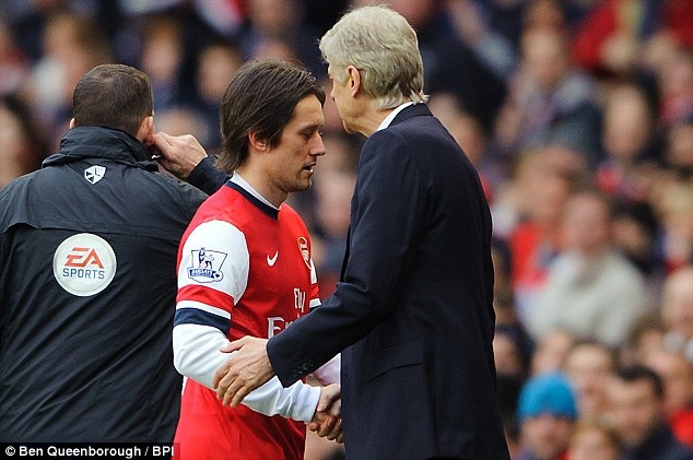 | HLV Wenger xác nhận ký hợp đồng mới với Rosicky có thời hạn đến năm 2015 với mức lương 4 triệu bảng/mùa. Ảnh: Daily Mail. |