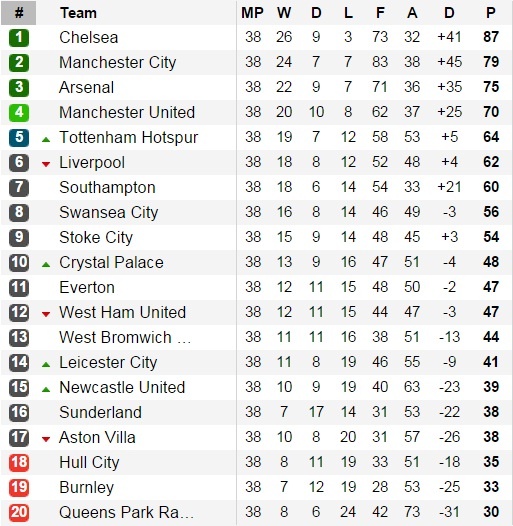 | Bảng xếp hạng Premier League mùa 2014/15. |