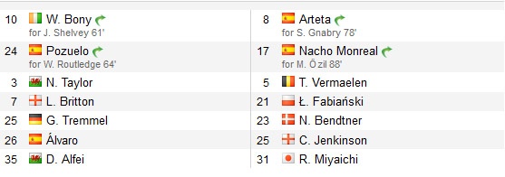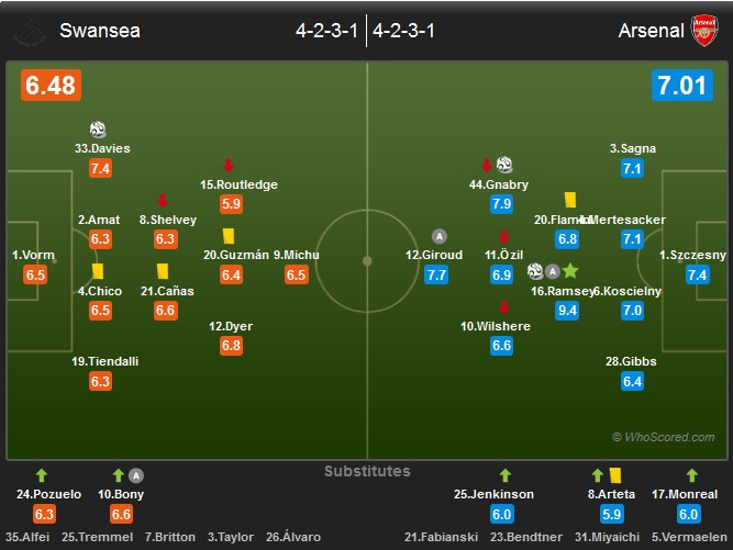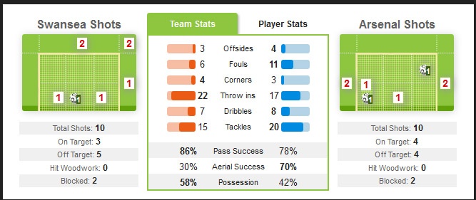 Trước khi trận đấu khép lại, Swansea có bàn thắng rút ngắn tỷ số xuống 1-2 do công của Ben Davies. Giành chiến thắng ở vòng 6, Arsenal tiếp tục dẫn đầu trên bảng xếp hạng với 15 điểm, hơn đội đứng ngay phía sau Tottenham 2 điểm.
