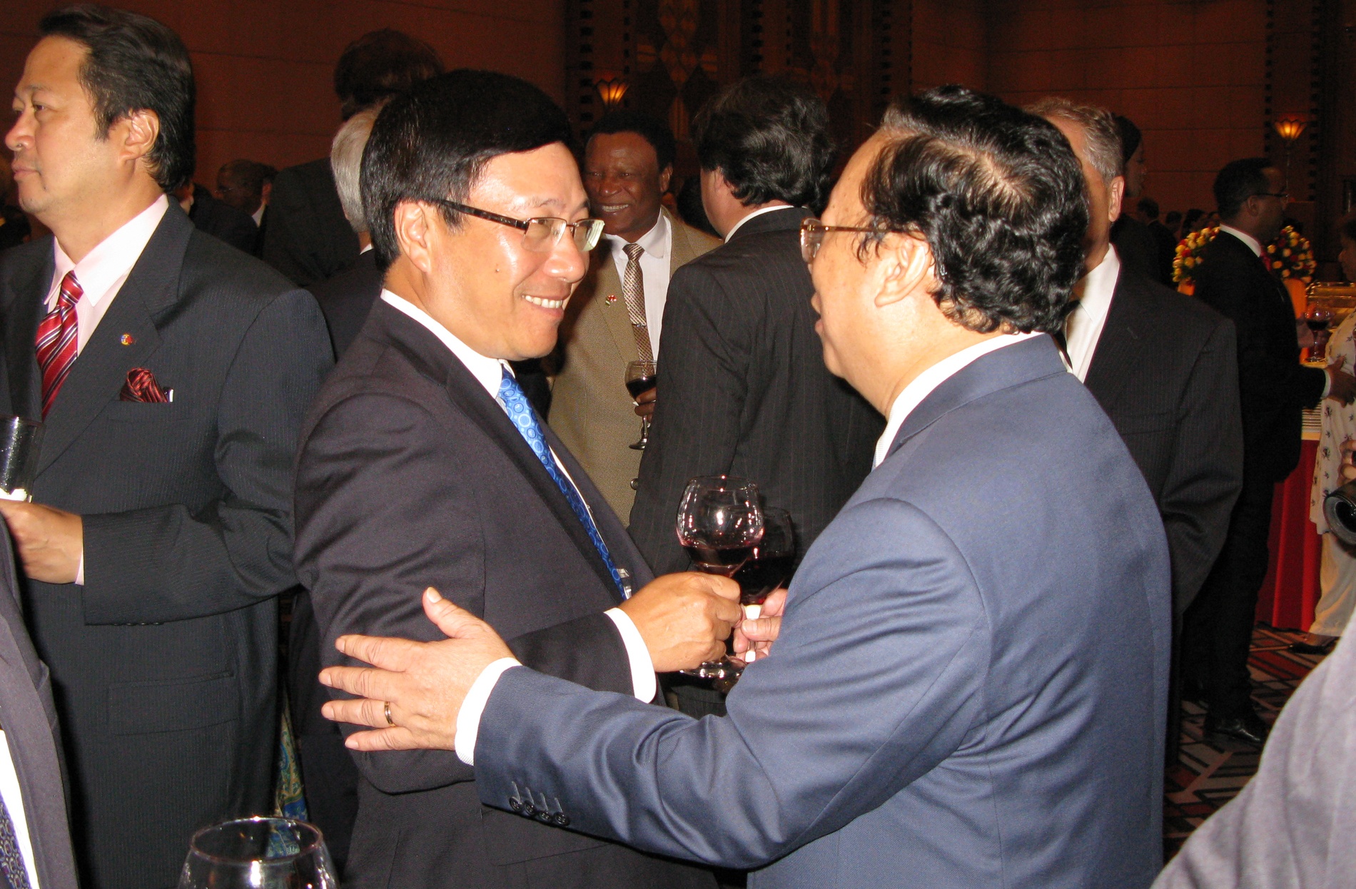 | Phó thủ tướng, Bộ trưởng Ngoại giao Phạm Bình Minh cùng các quan khách nâng ly nhân kỷ niệm 20 năm Việt Nam gia nhập Hiệp hội ASEAN. Ảnh: Phương Hà |