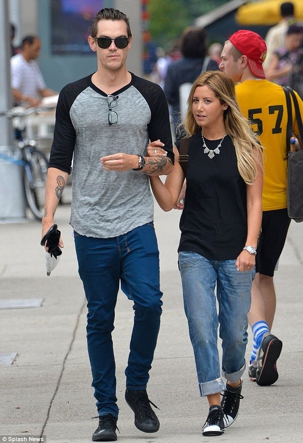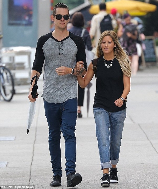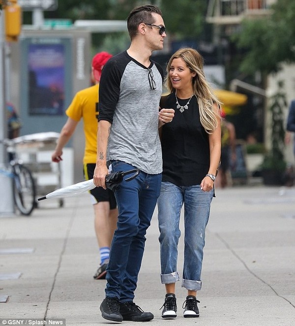 | Ashley Tisdale bước đi trên phố cùng hôn phu vào hôm sau đó. |