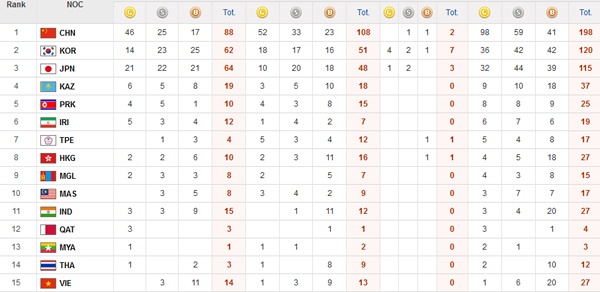 - Tính đến 9h50 ngày 28/9, tổng số huy chương của Đoàn thể thao Việt Nam tại ASIAD là 27, trong đó 1 HCV, 6 HCB và 20 HCĐ. Tuy nhiên, Đoàn thể thao Việt Nam đã rơi xuống vị trí thứ 15, trong đó đứng sau các quốc gia ở khu vực Đông Nam Á như Malaysia (3 HCV), Myanmar (2 HCV), Thái Lan (2 HCV).