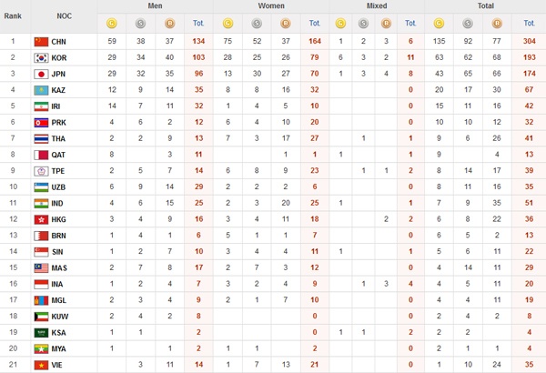 - Tính đến 15h15 ngày 2/10, Đoàn thể thao Việt Nam đứng thứ 21 trên bảng xếp hạng huy chương với 1 HCV, 10 HCB và 24 HCĐ.