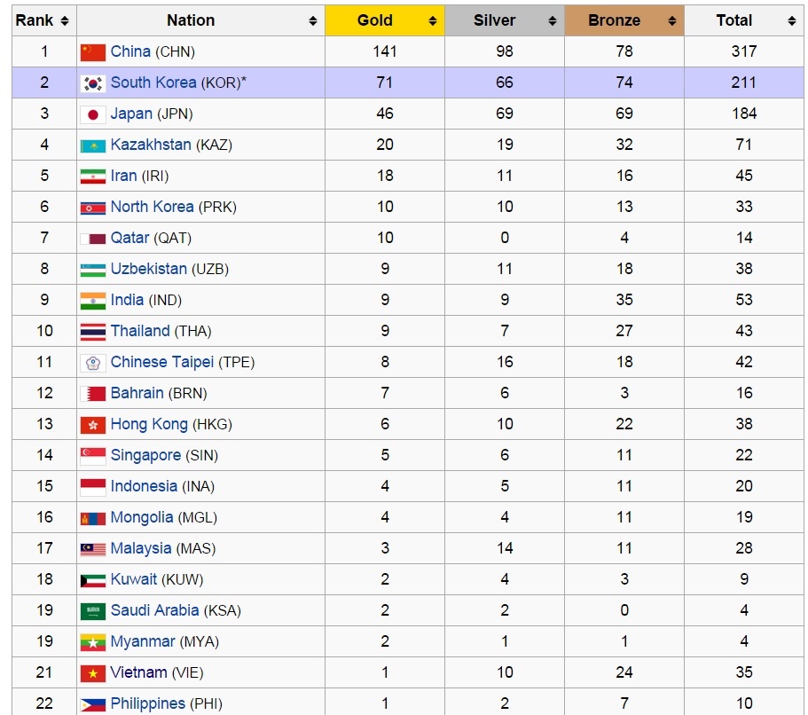 - Vị trí của Đoàn thể thao Việt Nam tại ASIAD 17 trên bảng xếp hạng tổng huy chương trước khi bước vào thi đấu trong ngày 2/10.