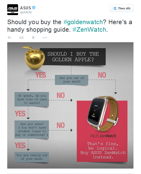 Tài khoản Twitter của nhà sản xuất Đài Loan vừa đăng hình ảnh nhằm châm biếm những ai đang có ý định sở hữu Apple Watch. Đây là bước khởi đầu trong chiến dịch quảng cáo trước khi giới thiệu ZenWatch ra thị trường.