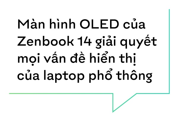 Nhờ sử dụng tấm nền OLED, Zenbook 14 OLED có thể hiển thị màu đen sâu hơn cùng độ sáng tối đa trên 500 nit. Thiết bị còn đạt chuẩn màu Pantone từ khi xuất xưởng, nên tôi có thể tin tưởng vào máy khi xử lý những dự án in ấn, cần độ chính xác cao về màu sắc.