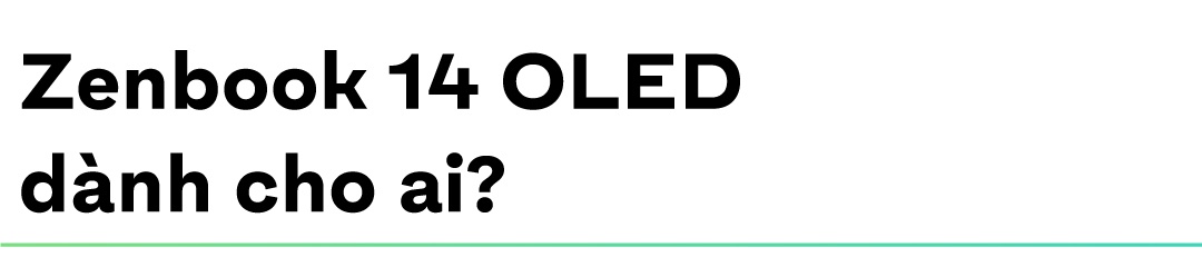 Là sản phẩm mỏng nhẹ ở phân khúc cao cấp, Zenbook 14 OLED phù hợp nhiều đối tượng người dùng như nhân viên văn phòng, doanh nhân có nhu cầu thường xuyên di chuyển cần một chiếc máy mỏng nhẹ nhưng đáp ứng xử lý mượt mà mọi tác vụ. Màn hình có độ chuẩn màu cao và hiệu suất tốt giúp thiết bị phục vụ nhu cầu của người làm việc thiết kế 2D, sáng tạo nội dung ở mức cơ bản.