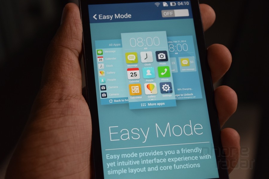Nếu thấy giao diện Zen Fone 5 quá phức tạp, bạn có thể chuyển sang chế độ Easy Mode để chỉ hiển thị các ứng dụng, shortcut quan trọng, thông báo cơ bản, đồng hồ trên màn hình. Truy cập Settings > Devices > Easy Mode để kích hoạt.