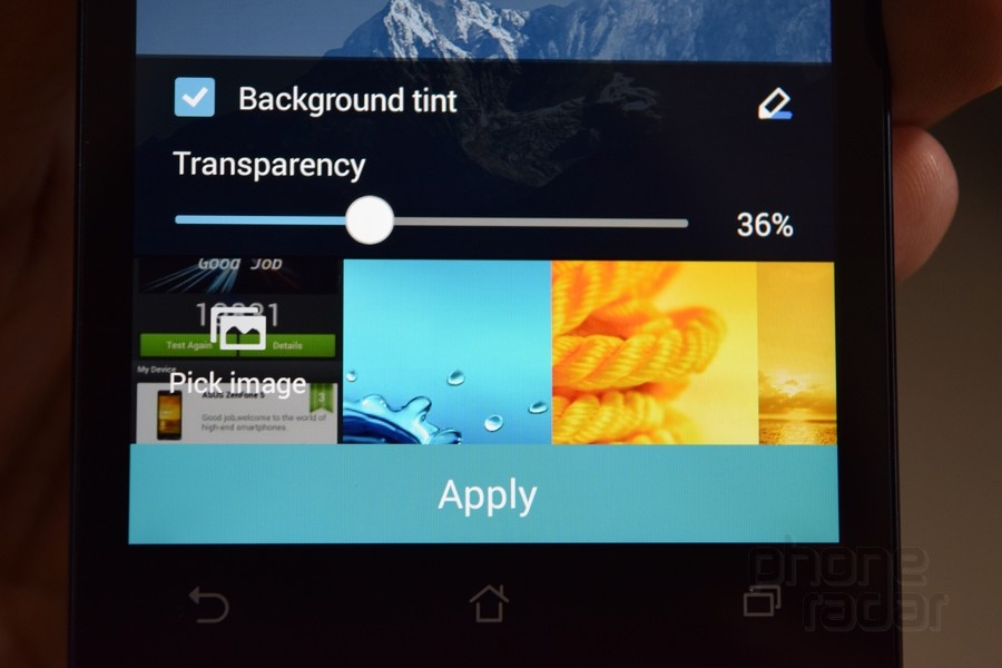 Một điểm thú vị trong ZenFone là bạn có thể thay đổi độ trong suốt của hình nền. Để làm điều này, chạm và giữ vào khoảng trống trên màn hình, chọn Wallpapers và kéo thanh Transparency cho đến lúc nào hài lòng.