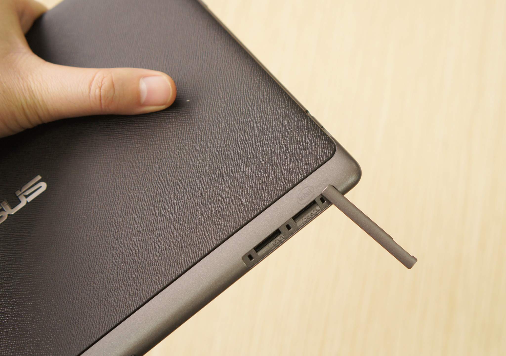 Khay cắm thẻ SIM và thẻ nhớ microSD của ZenPad 10. Model này được thiết kế để sử dụng ở chế độ ngang (landscape). |