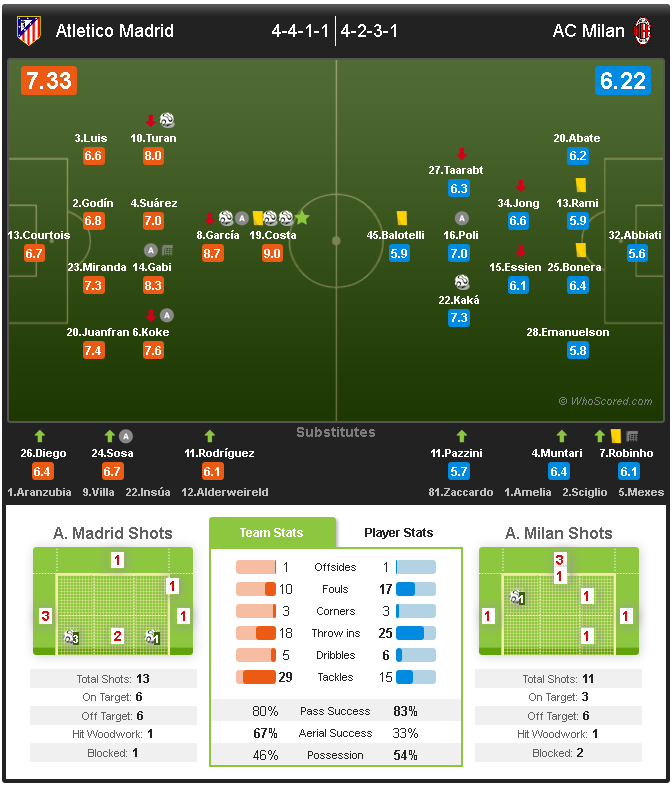 Atletico Madrid (4-4-2): Courtois; Juanfran, Godín, Miranda, Luis; Koke (Diego 82'), Gabi, Suárez, Turan (Rodriguez 78'); García (Sosa 72'), Costa.