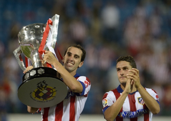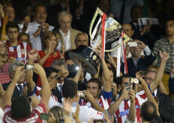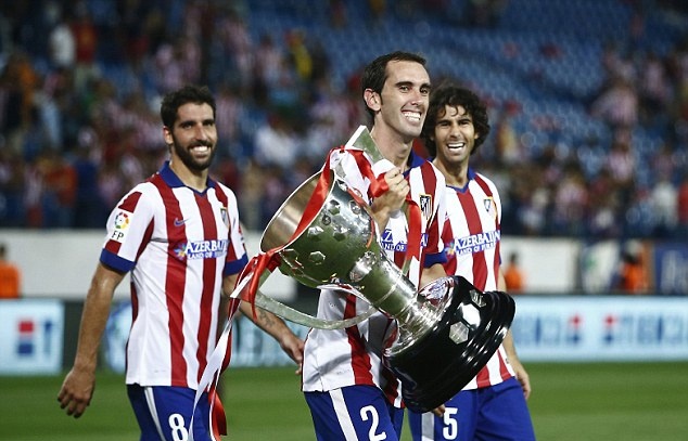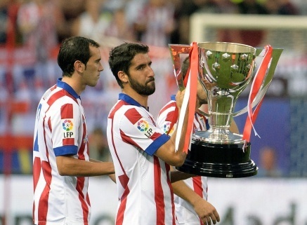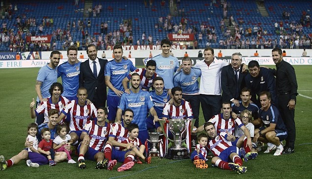 | Tuy nhiên, đội chủ sân Vicente Calderon không đồng ý và quyết định nhận danh hiệu vô địch ở trận đầu tiên trên sân nhà La Liga mùa này. Đội trưởng Diego Godin hào hứng với chiếc cúp lịch sử. |