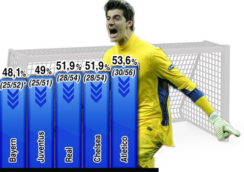 Không phải Chelsea, chính Atletico mới được xem như CLB phòng ngự hay nhất châu Âu mùa này. Tại La Liga, sức mạnh phòng ngự chính là mấu chốt giúp họ đang đặt một chân tới chức vô địch, khi là đội để thủng lưới ít nhất với chỉ 22 bàn thua. Trong khi đó, ở Champions League, đội bóng thành Madrid cũng đang sở hữu hàng thủ tốt nhất (tính từ vòng bảng), với việc chỉ chịu 5 bàn thua sau 11 trận. Tổng cộng, Atletico chỉ để thủng lưới vỏn vẹn 36 bàn/56 trận trên mọi đấu trường mùa này, trung bình chỉ 0,64 bàn/trận.
