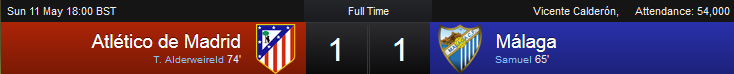 Bước sang hiệp 2, Malaga bất ngờ tăng tốc và nếu không có sự xuất sắc của thủ thành trẻ Courtois, A.Madrid đã sớm phải nhận bàn thua. Tuy vậy, đến phút 65, trong khoảnh khắc lúng túng của hàng thủ đội chủ nhà, Samuel đã tận dụng cơ hội rất tốt để mở tỷ số trận đấu.