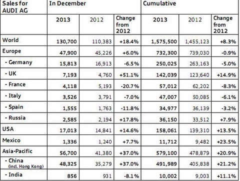 Theo thông cáo vừa được tập đoàn Audi công bố, trong năm 2013, tập đoàn này bán được khoảng 1.575.500 chiếc xe Audi trên toàn thế giới, tăng 8,3% so với năm 2012, và là năm thứ tư liên tiếp, doanh số bán mỗi năm đều tăng hơn 100.000 chiếc. Sự tăng trưởng này chủ yếu nhờ hoạt động xuất khẩu, trong đó có 3 thị trường lớn có mức tăng trưởng 2 con số là Trung Quốc tăng 21%, Mỹ tăng 13,5% và Anh tăng 15%.