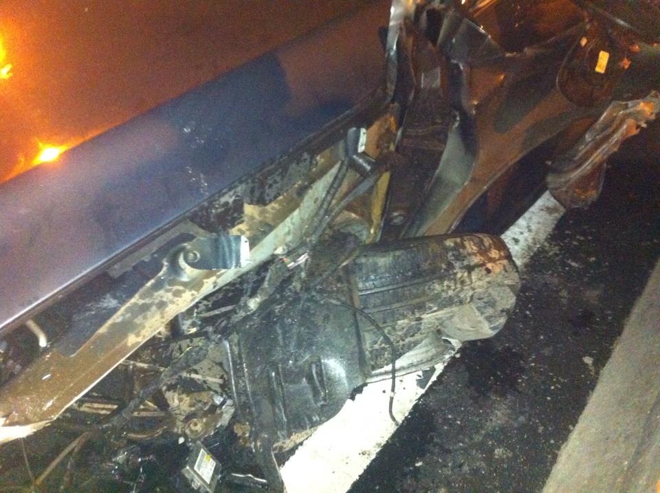 Đến cuối dốc cầu, hướng từ Vĩnh Phúc đi Hà Nội, chiếc xe mất lái, đâm vào dải phân cách dưới chân cầu. Chiếc xe sang bị vỡ toang phần đầu bên lái; các túi khí trên xe đều nổ...