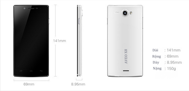 Aveo X8 không chỉ sở hữu thiết kế tinh tế và sang trọng với độ mỏng chỉ khoảng 8 mm mà còn sở hữu cấu hình tốt với mức giá tầm trên 5 triệu đồng. Máy có chip lõi tám MTK6592 tốc độ 1,7 Ghz x8, RAM đa luồng kênh 3 thế hệ mới dung lượng 2 GB, bộ nhớ 8 GB có thể nâng cấp lên 64 GB, hệ điều hành Android 4.4 Kitkat mới.