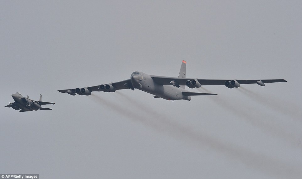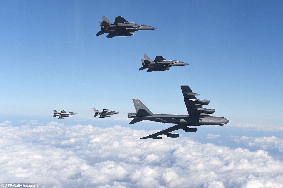 Máy bay F-15 của Hàn Quốc (bên dưới) và 2 chiếc F-16 của Mỹ (bên trên) hộ tống chiếc B-52. Mỹ luôn khẳng định Hàn Quốc được “chiếc ô hạt nhân” của Mỹ bảo vệ. Ảnh: AFP |
