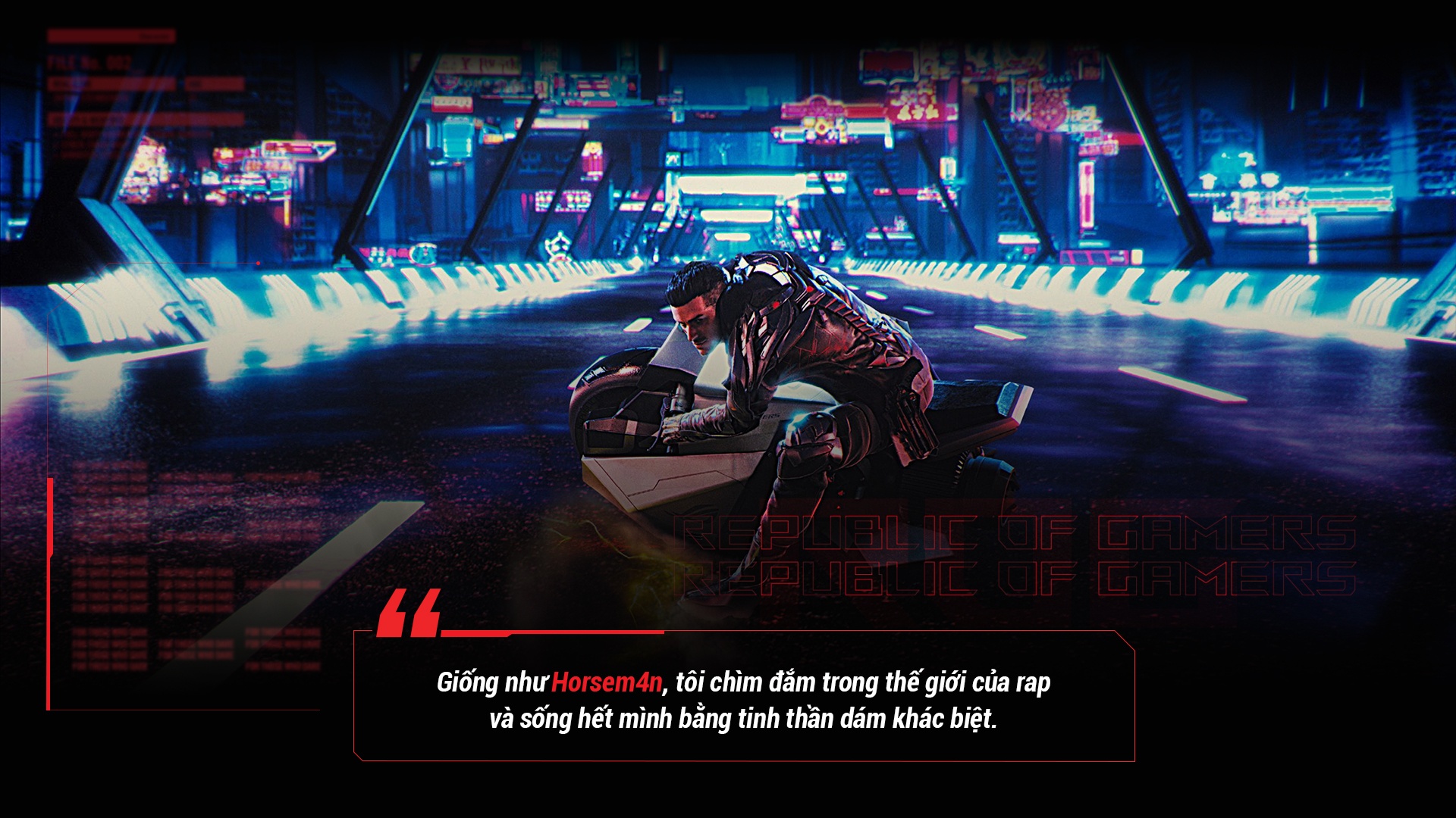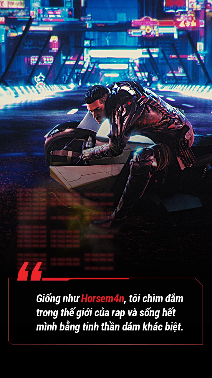 Thay vì bị kìm chân bởi định kiến “mất chất”, anh cố gắng tìm cách chứng minh mình đang chọn hướng đi khác biệt, không theo bất kỳ khuôn mẫu nào. Niềm tin này của nam rapper càng được củng cố khi tình cờ biết đến thế giới cyberpunk của ROG với những anh hùng G.A.M.E.R.s dám khác biệt, sẵn sàng chiến đấu vì lý tưởng tốt đẹp và những gì họ tin tưởng. Chính họ đã truyền cảm hứng để anh vững bước trên con đường âm nhạc của mình.