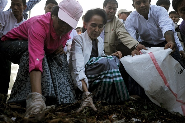 | Bà Aung San Suu Kyi dọn rác ở một vùng ngoại ô Yangon ngày 13/12. Ảnh: AFP |