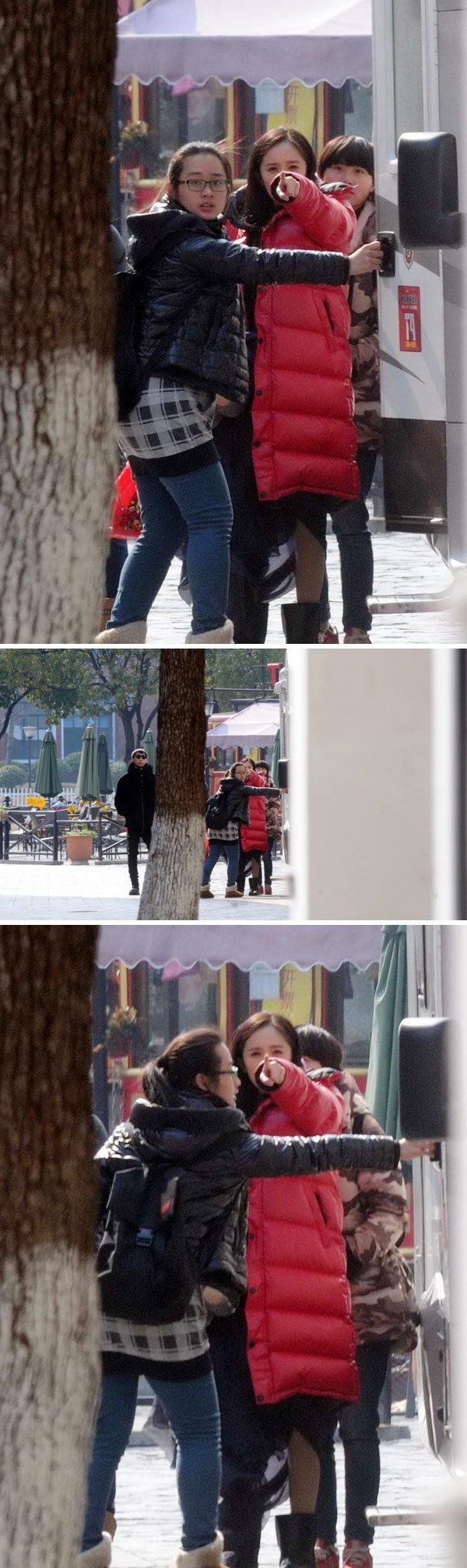 | Hành động chỉ tay về phía cánh săn ảnh của Dương Mịch bị khán giả nhận xét là "vô học". |