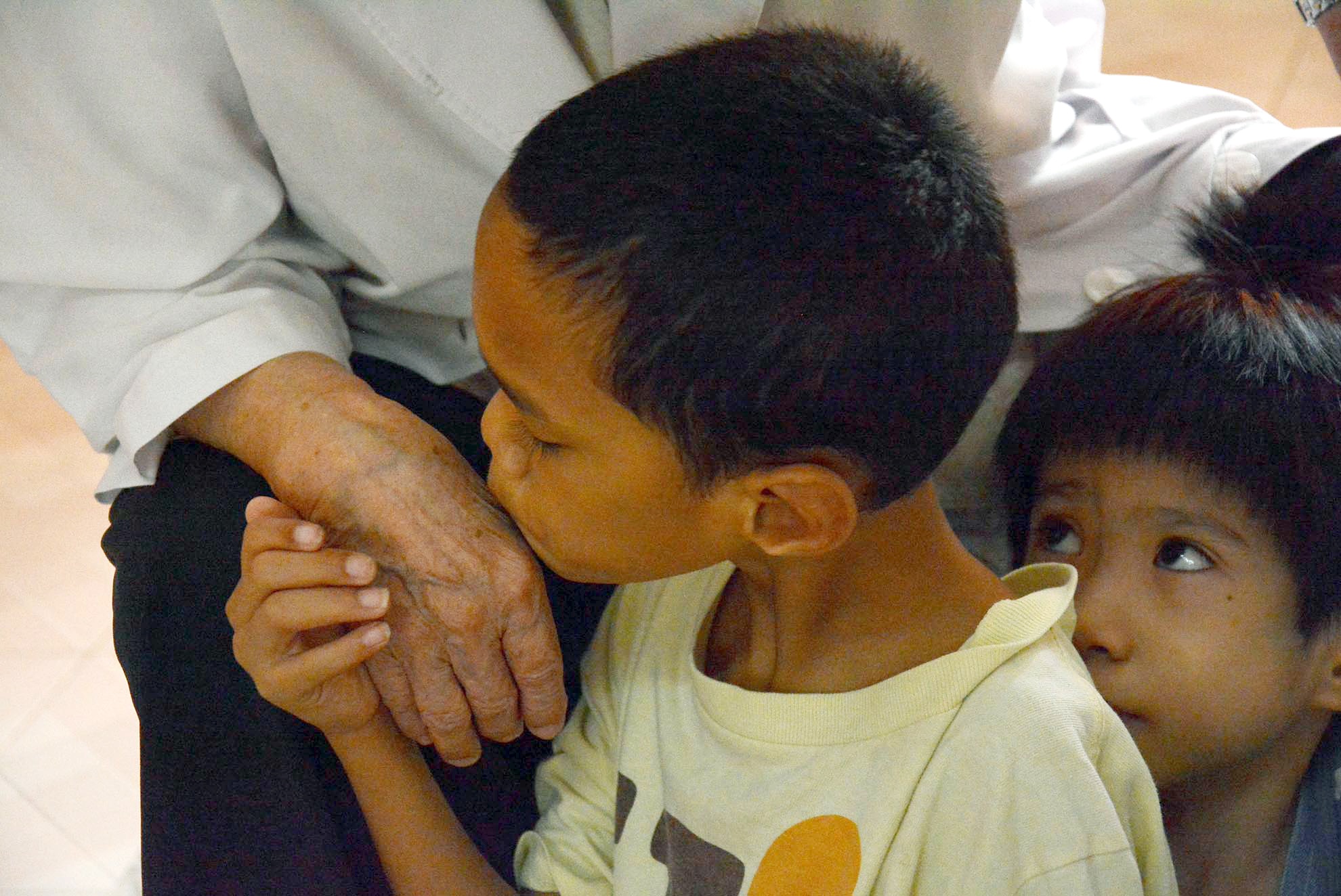 Em Trần Thị Vy (13 tuổi) bị bệnh cứng đa khớp tứ chi và bại não. Vy là một trong những em nhỏ nhất ở làng Hòa Bình nên rất nhận được nhiều tình thương của bà.
