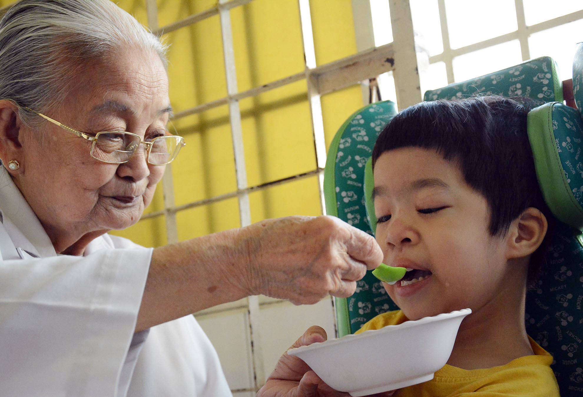 | Nơi đây có 39 cán bộ, nhân viên, trong đó 36 là nữ. Mọi người ở đây cùng với bà Chung vừa chăm lo việc ăn uống, chăm sóc sức khỏe, tập trị liệu, dạy chữ cho các em. Trong ảnh là nữ điều dưỡng Trần Thị Hồng Vân. |