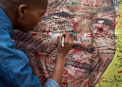 | Người dân viết lời cầu nguyện trên poster in hình ông Mandela bên ngoài nhà cũ của ông ở Soweto, Johannesburg hôm 6/12. Ảnh: AP |
