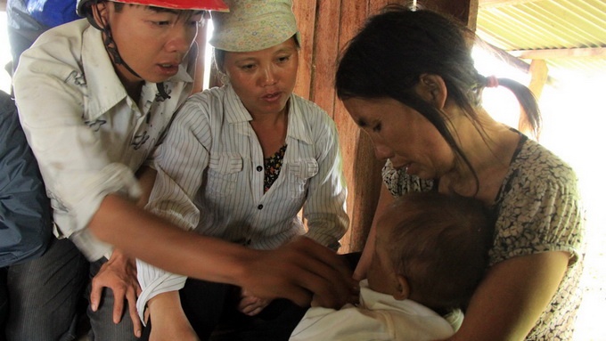 | Nhân viên y tế thăm hỏi sức khỏe mẹ con chị Pàng. |