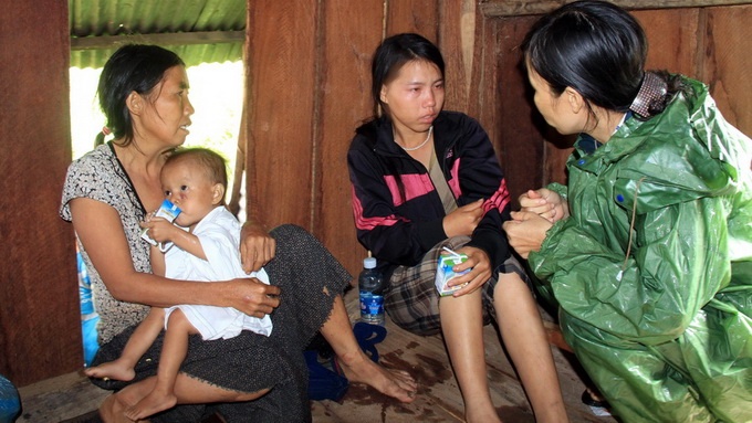 | Mẹ con chị Pàng vừa được cứu lên bờ trong tình trạng đói rét, sức khỏe suy kiệt sau ba ngày nhịn đói giữa mưa lũ. |