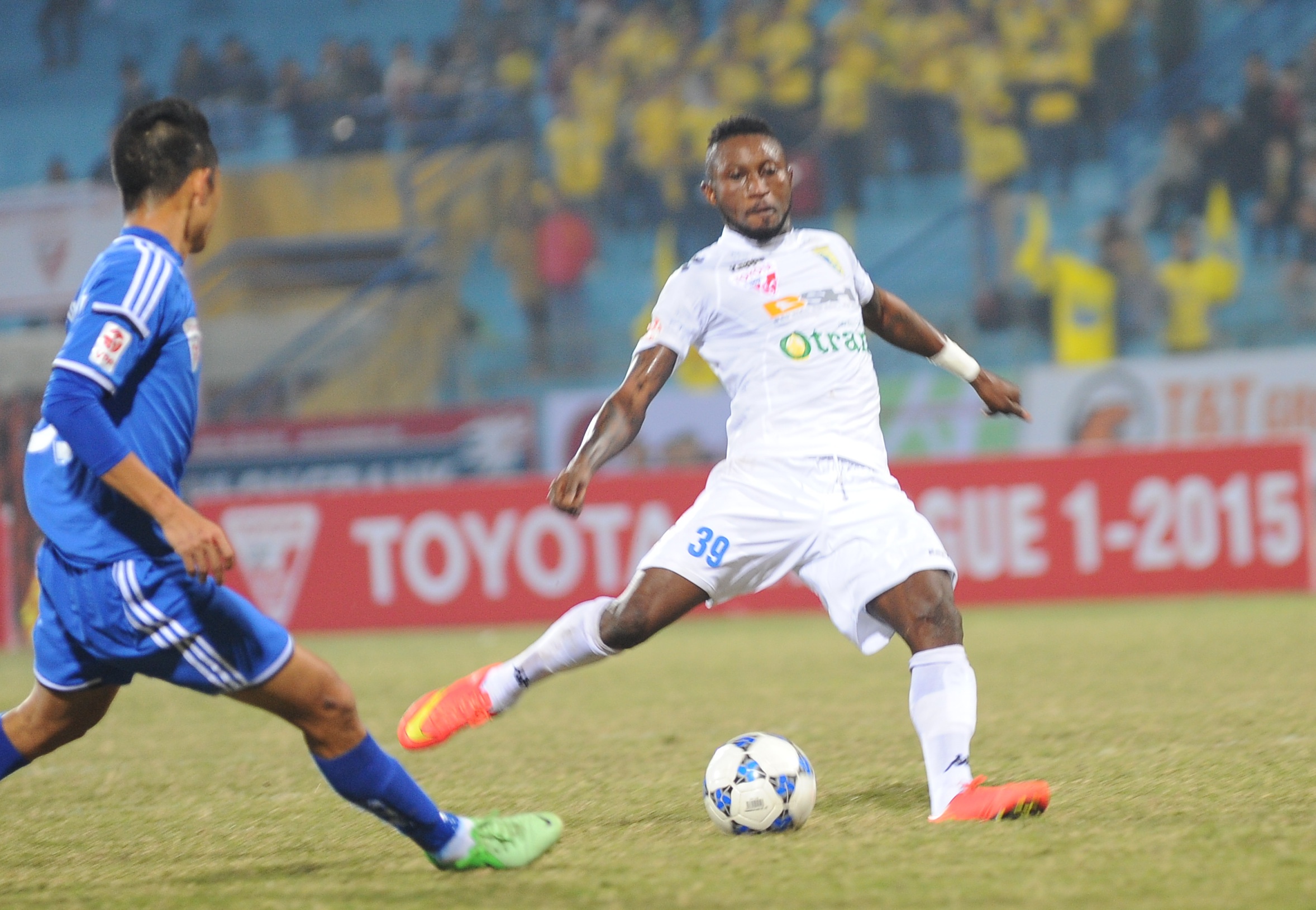 | Samson ở tư thế thoải mái ghi bàn thắng hoàn tất cú hattrick đầu tiên tại V.League 2015. |