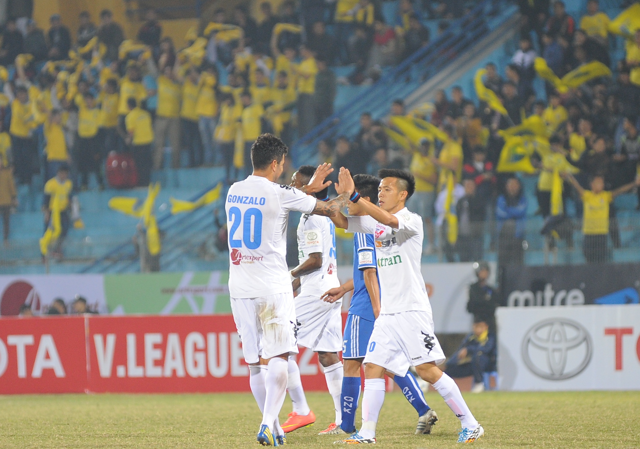 | Cầu thủ ghi bàn Gonzalo chạy tới ăn mừng như lời cảm ơn pha kiến tạo của đồng đội Văn Quyết. |
