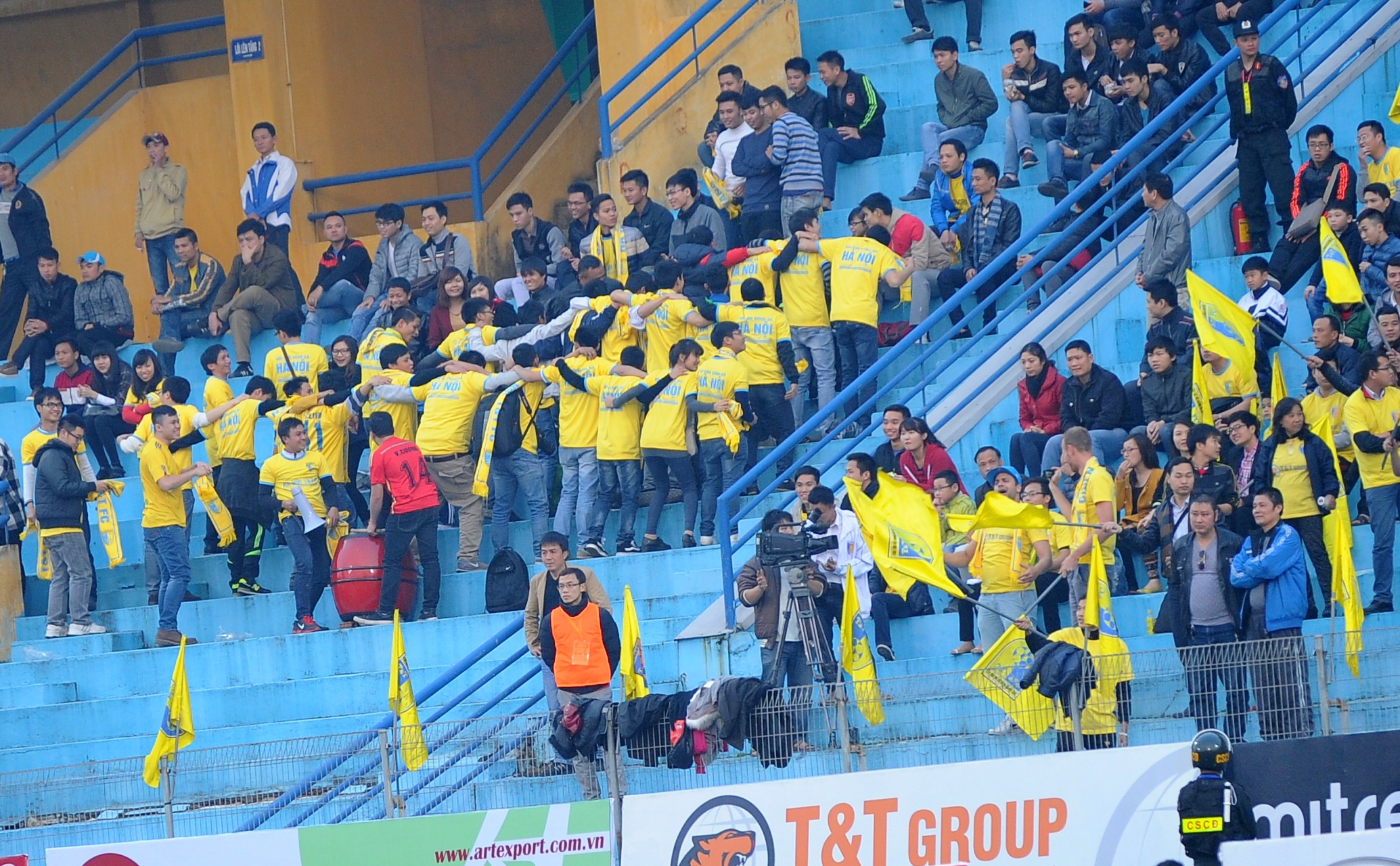 | Cách ăn mừng quay lưng độc đáo của CĐV Hà Nội T&T khi đội nhà ghi được tới 4 bàn thắng vào lưới đội khách Quảng Nam. |