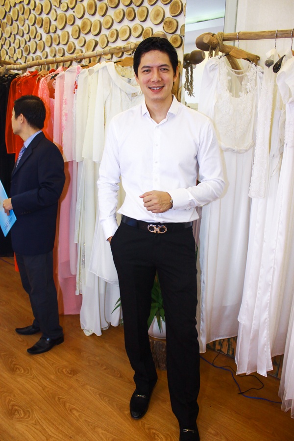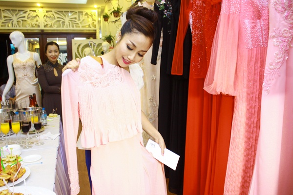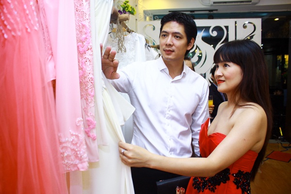 Phương Bùi hướng đến phong cách nữ tính và sang trọng, đây cũng chính là phong cách thời trang mà bà xã Bình Minh yêu thích. Nhân buổi gặp gỡ, chị được chồng tư vấn chọn một số mẫu váy mới. Thiết kế của Phương Bùi được làm trên chất liệu ren thêu cầu kỳ được nhập từ nước ngoài. Anh Thơ tỏ ra rất thích những chiếc váy có tông màu trắng nhã nhặn.