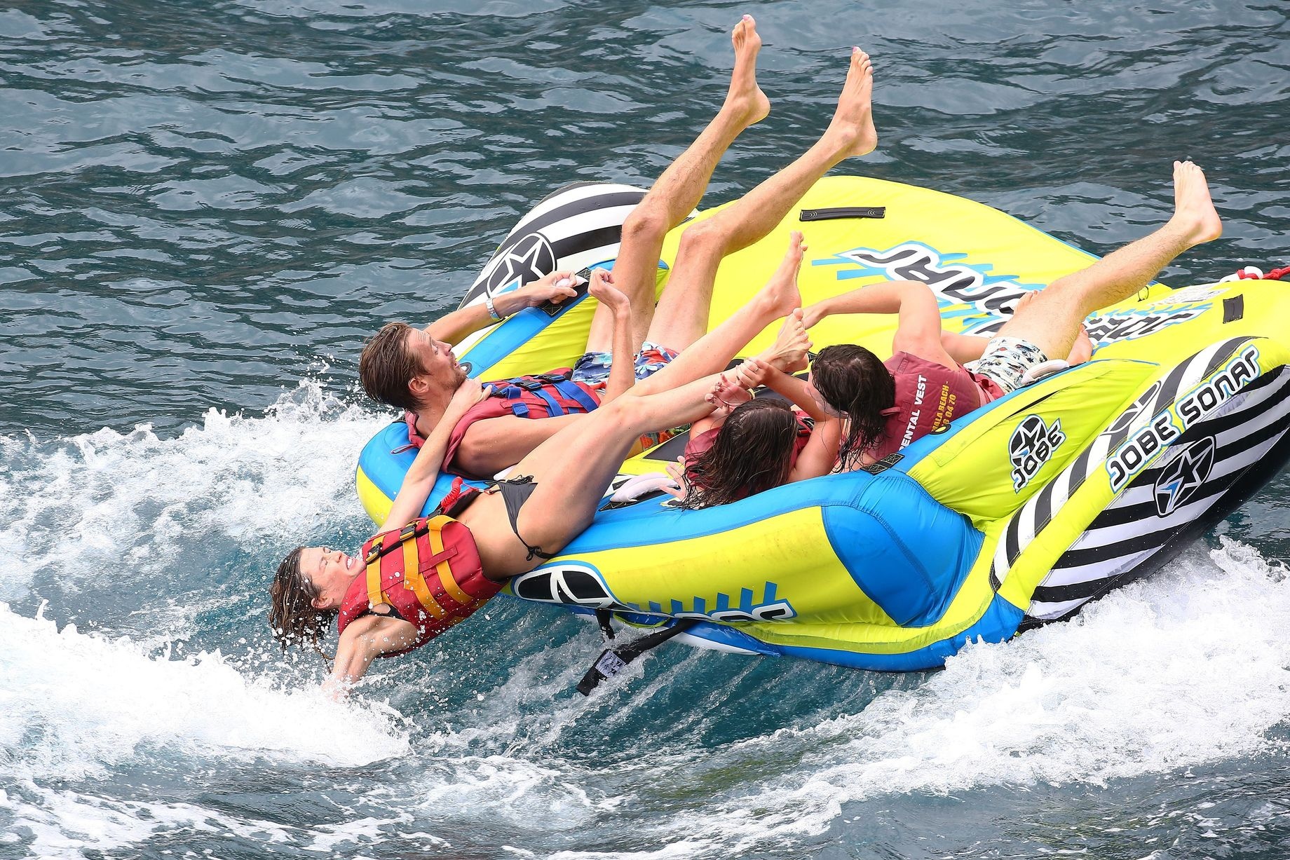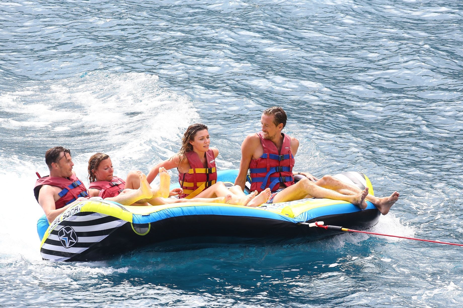 | Vợ chồng tiền đạo người Anh khá thích thú với các trò chơi trên biển. |