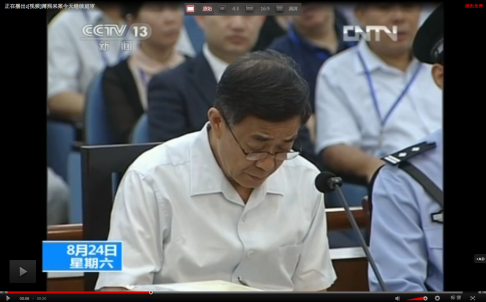 | Bị cáo Bạc Hy Lai trong phiên xét xử ngày 24/8. Ảnh: CCTV. |