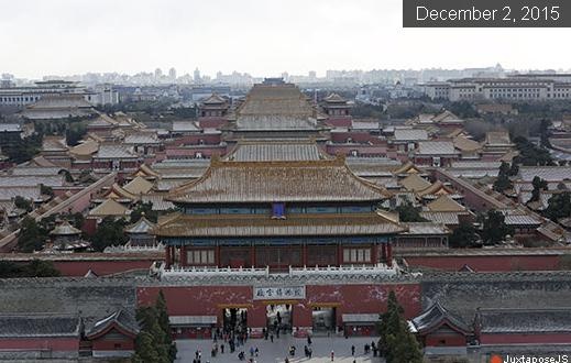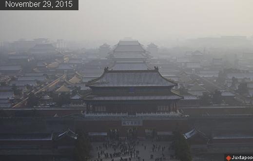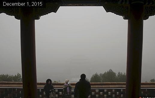 Du khách chụp hình tại công viên Cảnh Sơn, đối diện Tử Cấm Thành, trong ngày 1/12 khi sương mù phủ kín toàn thành phố Bắc Kinh. Trái ngược là cảnh quang đãng 24 giờ sau. Tuy nhiên, hiện tượng sương mù dày đặc quay trở lại trong vài ngày qua. Ngày 7/12, Bắc Kinh lần đầu nâng mức cảnh báo lên báo động đỏ - mức cao nhất trong thang cảnh báo ô nhiễm không khí. Mức độ ô nhiễm hiện tại của thủ đô Trung Quốc còn nghiêm trọng hơn hình trái. Ảnh: Reuters |