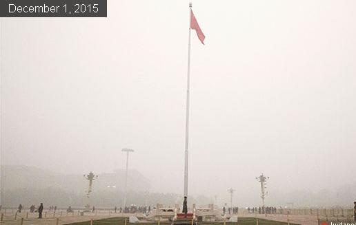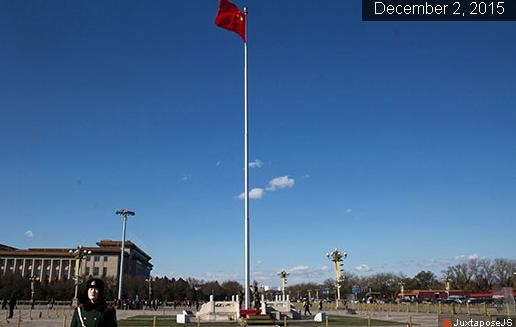 Quảng trường Thiên An Môn chìm trong làn khói mù dày đặc vào ngày 1/12 và khung cảnh trái ngược 24 giờ sau trời quang đãng. Ảnh: Getty |