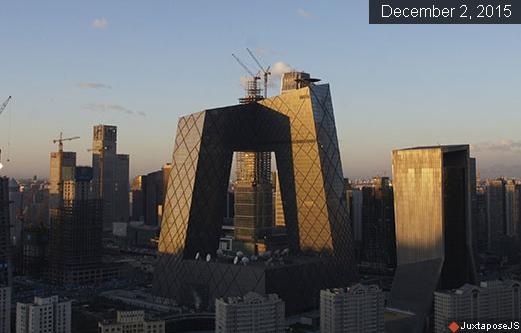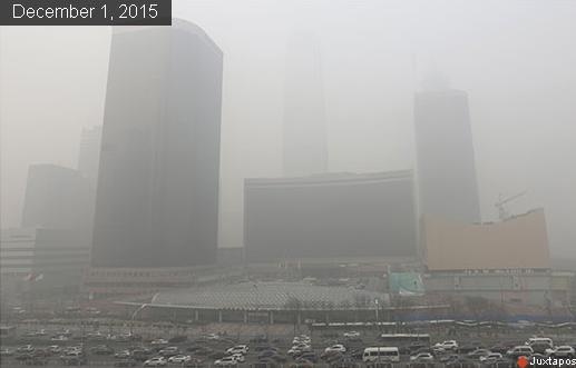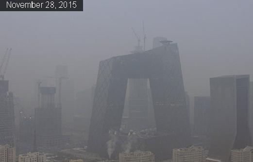Hình ảnh tòa tháp Truyền hình Trung ương Trung Quốc (CCTV) và khu thương mại trung tâm (CBD) khác biệt trong hai ngày 28/11 và 2/12. Chính quyền Bắc Kinh sáng 29/11 đã nâng cảnh báo ô nhiễm không khí lên báo động cam khi nồng độ bụi PM2,5 đo được là 300 mg/m3. Đây là mức cao gấp 12 lần so với tiêu chuẩn của Tổ chức Y tế Thế giới. Ảnh: Reuters |
