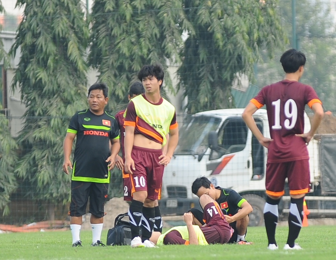| Dù được các bác sĩ chăm sóc, tiền đạo sinh năm 1994 của lò đào tạo SLNA tỏ ra đau đớn và không thể tiếp tục tập luyện. |