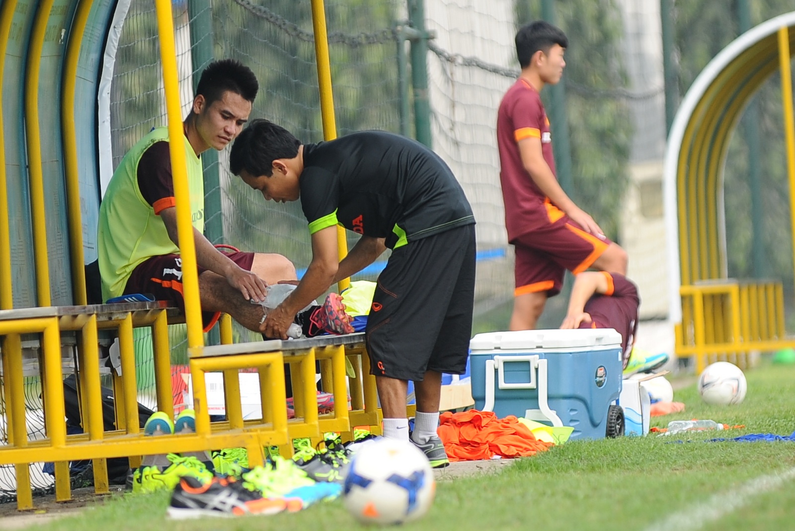 | Phúc Tịnh rời sân và sớm kết thúc buổi tập cùng Olympic Việt Nam. Bác sĩ Hoàng Nghĩa Dương ngay lập tức cho tiền đạo trẻ chườm đá và chờ thời gian để chẩn đoán mức độ nặng, nhẹ của chấn thương. Ngoài Phúc Tịnh, 2 cựu cầu thủ U19 Việt Nam là Xuân Trường (sau) và Duy Mạnh vẫn đang tập nhẹ với giáo án riêng. |