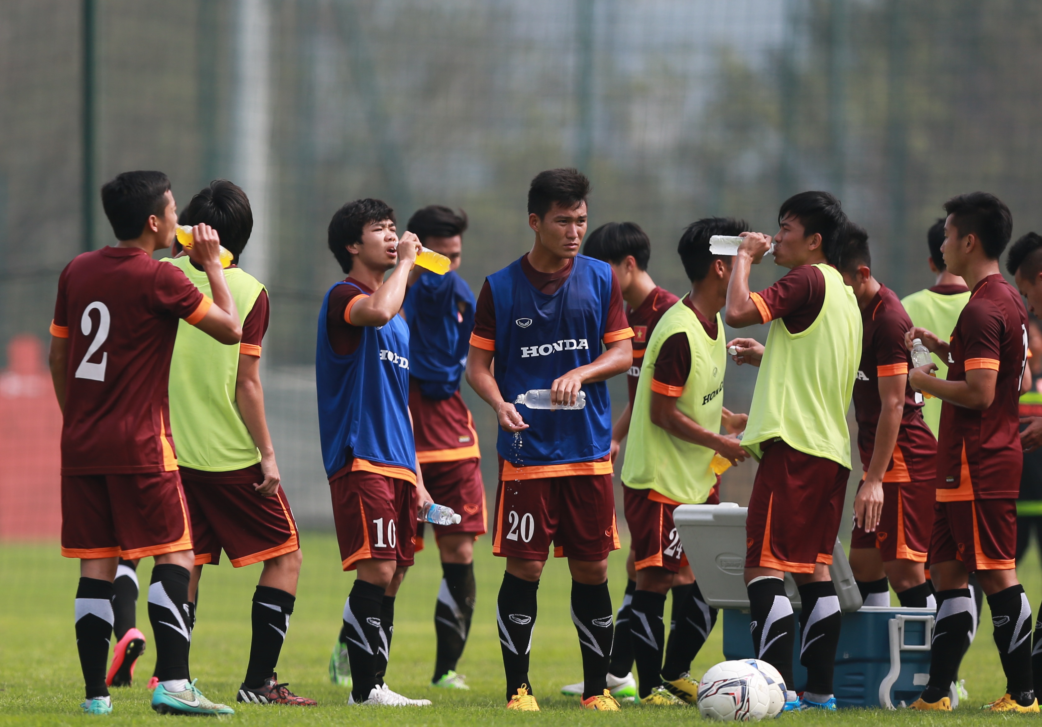 | Buổi tập sáng nay của Olympic Việt Nam diễn ra từ 9h30 đến 11h30, thời tiết khá nắng nóng khiến các cầu thủ liên tục phải tiếp nước. |