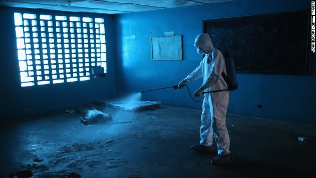 | Nhân viên y tế phun thuốc khử trùng xung quanh xác một người đàn ông trong một phòng học, vốn được sử dụng làm khu vực cách ly nạn nhân đại dịch Ebola ở Liberia. Ảnh: CNN |