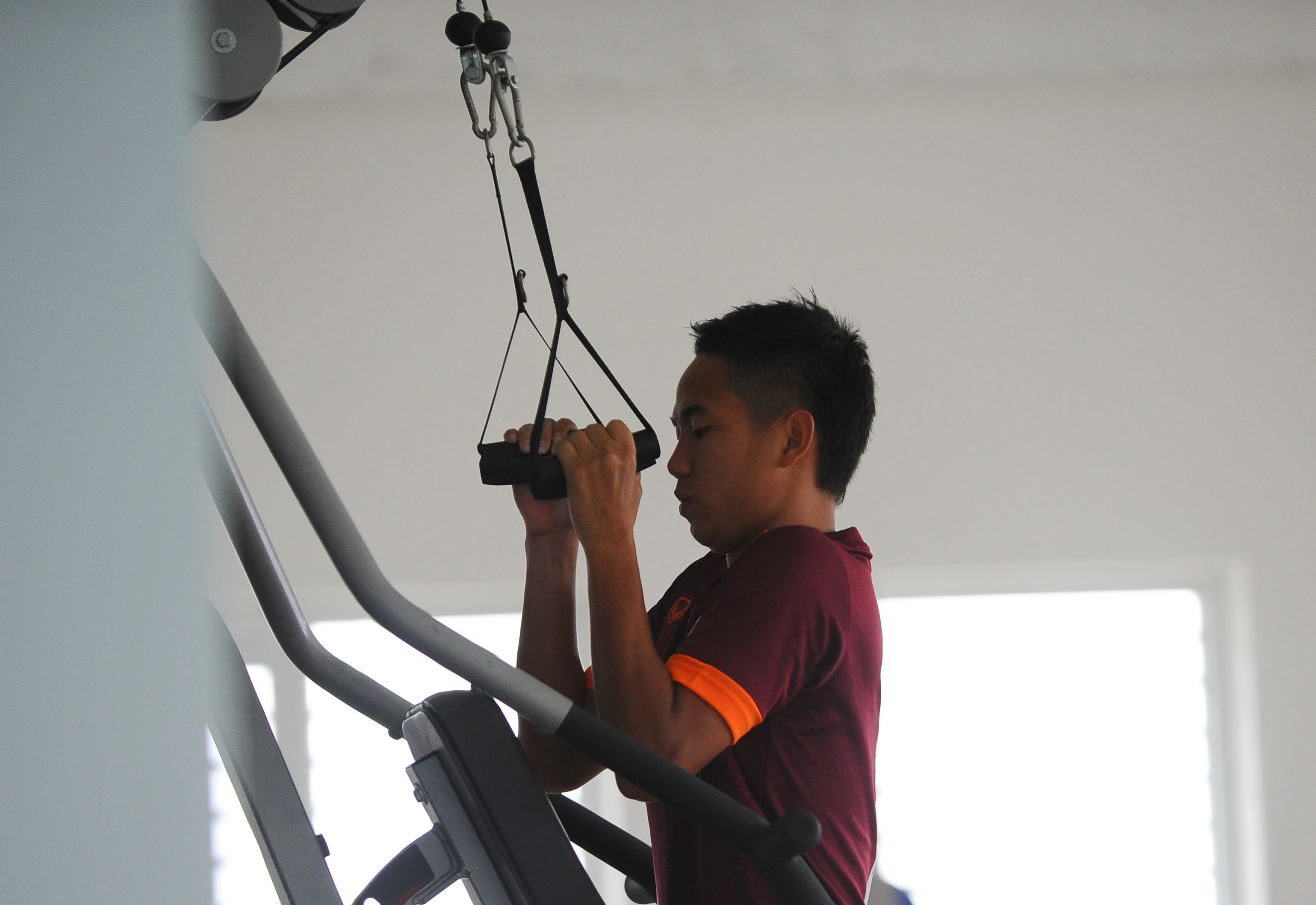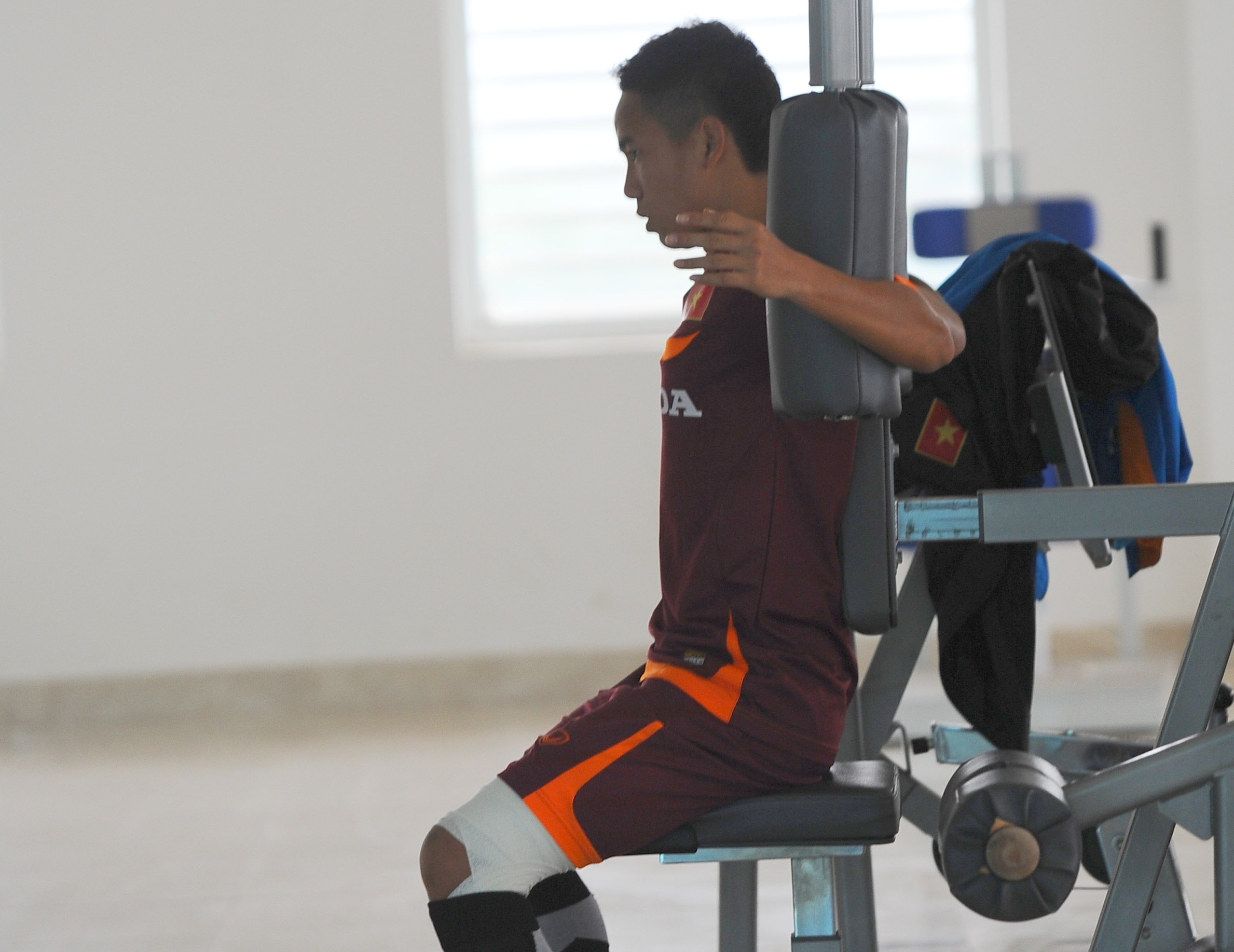 | Tiền đạo Hồ Tuấn Tài bị tràn dịch vùng gối nên không thể chạy mạnh. Anh chọn máy kéo tạ tay để giữ phom. |