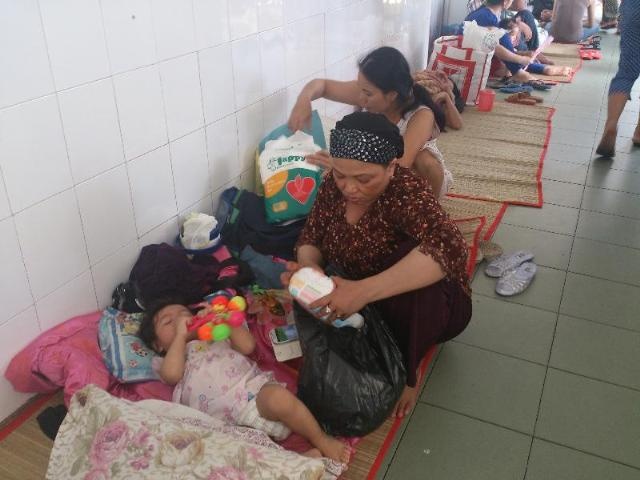 | Mặc dù có giường nhưng nhiều bé phải ra hành lang nằm tranh lây sởi. |