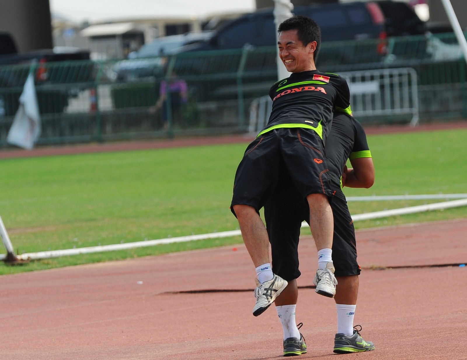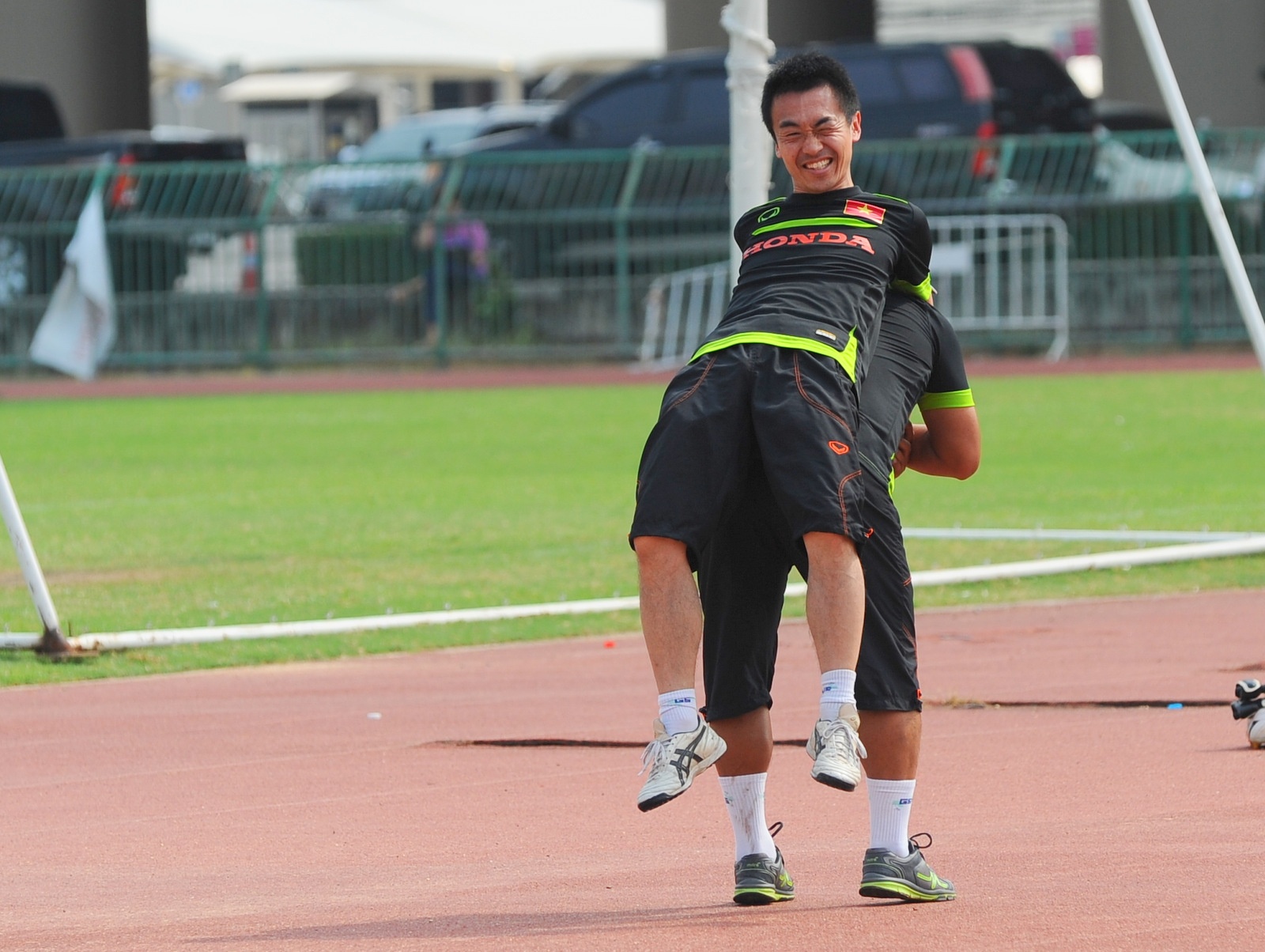 | Tranh thủ lúc các tuyển thủ tập luyện, trợ lý của ĐT Olympic Việt Nam đã nhấc bổng bác sĩ Shinichi. |